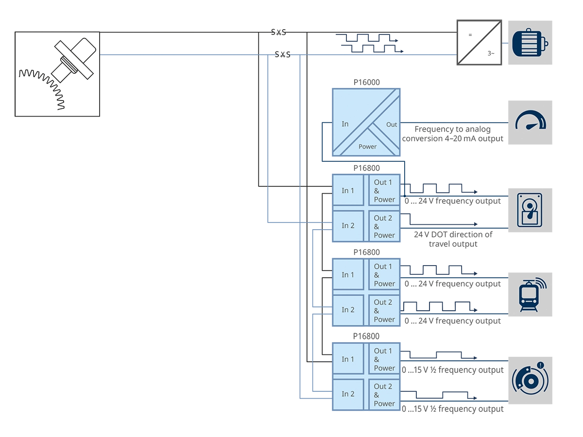 Pulse frequency conditioners for decoupling signals from safety-relevant circuits and converting standard signals and impulse signals. Thanks to P16000 at the SIL 3 safety level, the speed signal is neither influenced nor interfered with.