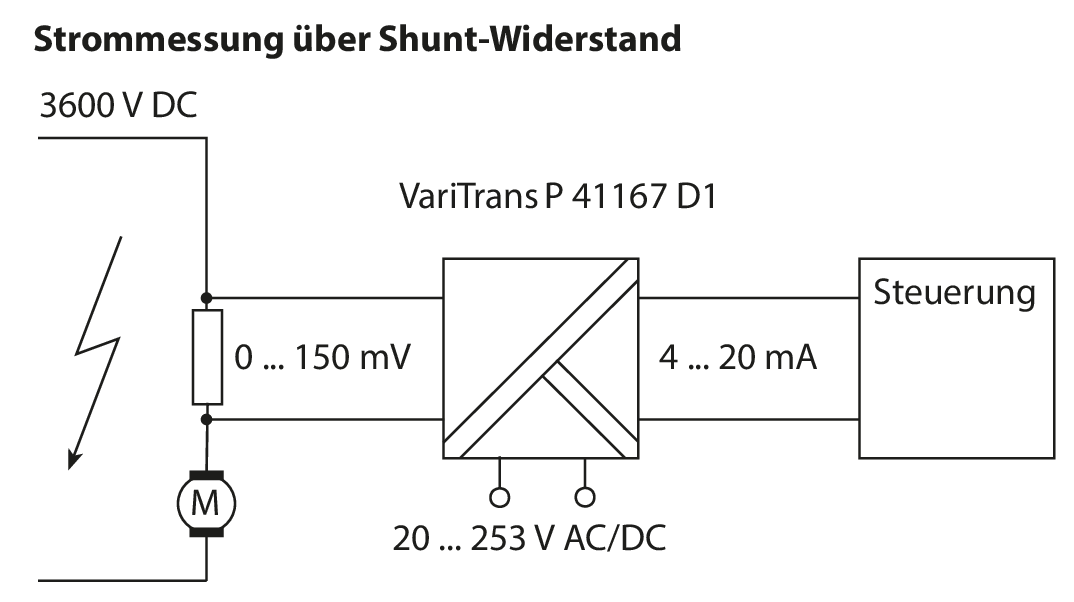 Schutz vor gefährlichen Körperströmen ist durch Sichere Trennung nach DIN EN 61140 vom Eingang zum Ausgang und zur Hilfsenergie gegeben. Speziell ausgelegt für die Anwendung Strommessung über einen Shunt-Widerstand.