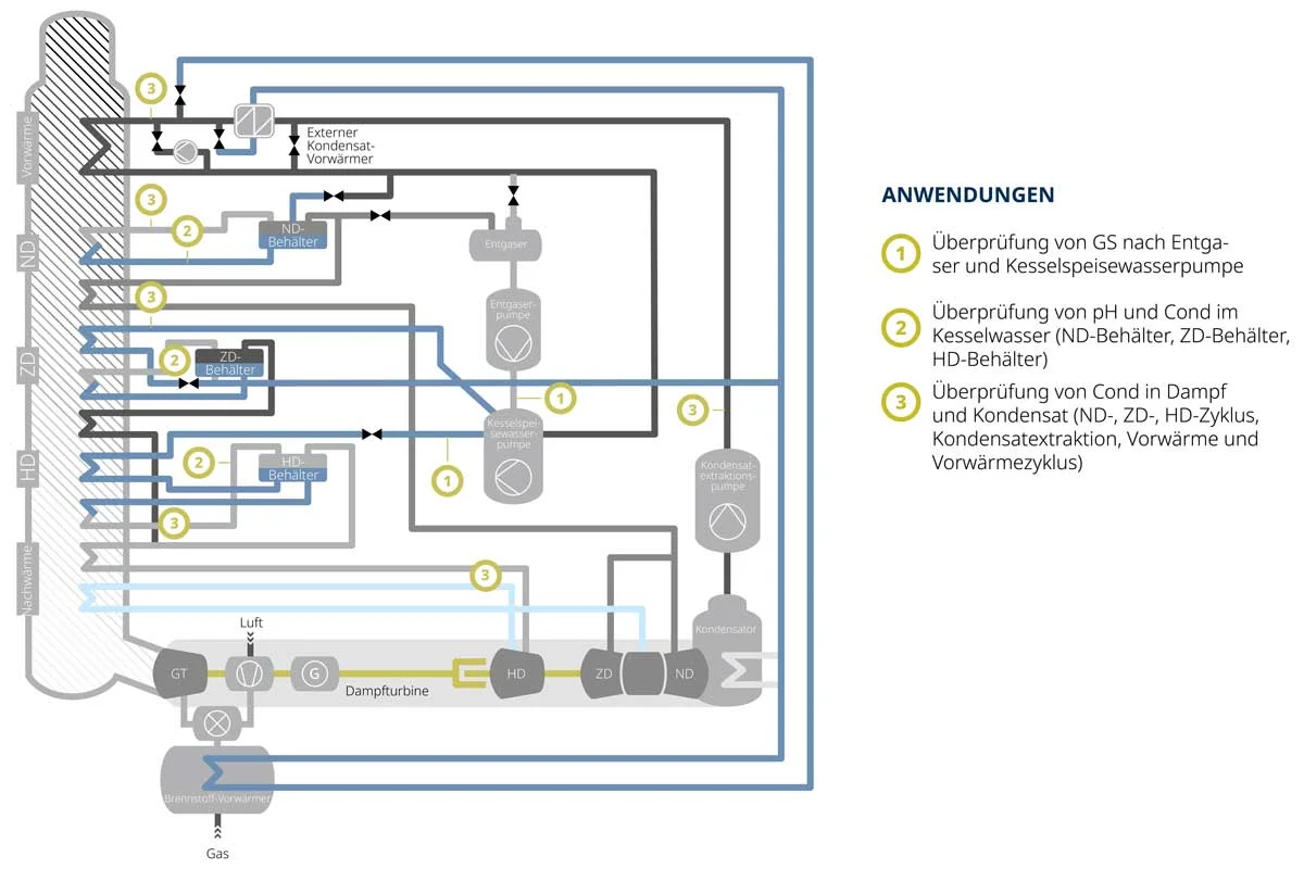 Viele moderne Kraftwerke werden als Gas-und-Dampf-Kombikraftwerke betrieben. In einem ersten Schritt erzeugt dabei eine Gasturbine Elektrizität. Das heiße Abgas aus der Gasturbine wird in ein konventionelles Heizkesselsystem mit einer weiteren Dampfturbine geführt und sorgt so für einen sehr guten Gesamtwirkungsgrad. In der Prinzipdarstellung unten sind die Messstellen für pH, Cond und GS hervorgehoben.