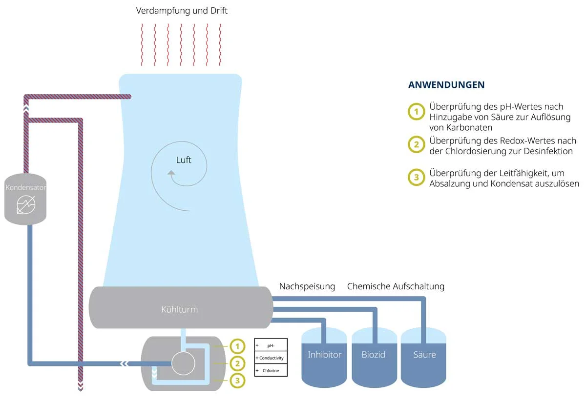 Hin und wieder muss eine Absalzung durchgeführt werden. Austausch von hochkontaminiertem Kühlwasser durch sauberes Wasser, um die Chemikalienkonzentration zu senken, kontrolliert durch eine Leitfähigkeitsmessung. Siehe beigefügte Prinzipdarstellung mit Angaben zu den Messparametern und -stellen.