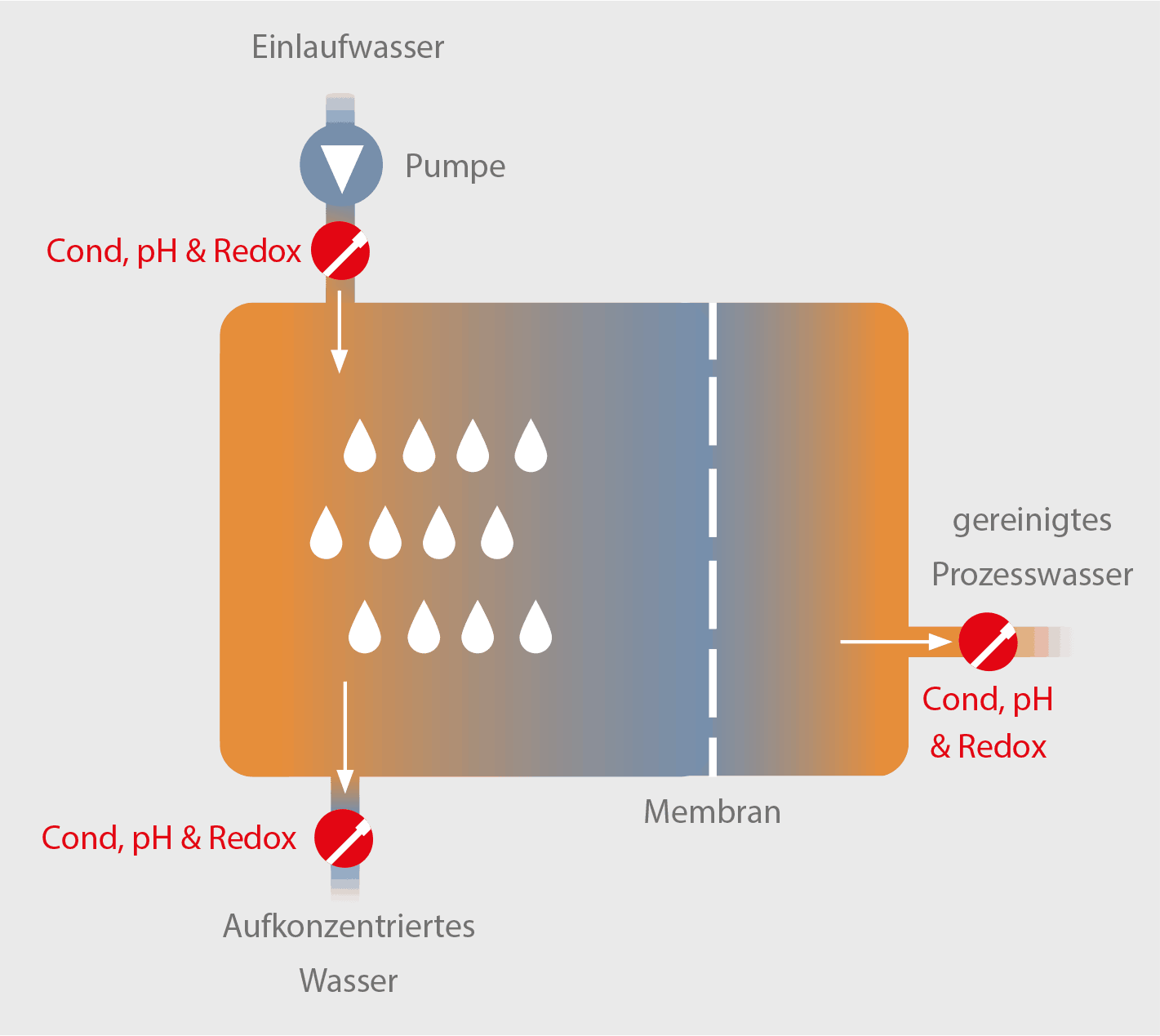 Umkehrosmose-Überwachungssysteme erfordern eine Inline-Messung von pH-Wert, Redoxpotential und Leitfähigkeit. Durch Hinzugabe verschiedener Chemikalien während des Prozesses wird verhindert, dass sich organische oder anorganische Ablagerungen an der Osmosemembran festsetzen. Bei unpräziser Dosierung kann die Membran beschädigt und biologisches Wachstum begünstigt werden. Folge: Die Systeme müssen heruntergefahren und aufwändig gereinigt werden. Die Möglichkeit, Leitfähigkeitswerte im Mikronenbereich und die Sollwertabweichung von Redoxpotential und pH-Wert zu messen, ist eine der zentralen Voraussetzungen dafür, die Lebensdauer der Membran zu verlängern und Kosten für einen frühzeitigen Austausch zu sparen. Die Menge eingesetzter Chemikalien wie Chlor und Natriumbisulfit kann signifikant verringert werden, wenn die Leitfähigkeit, pH-Wert und Redoxpotential präzise erfasst werden.