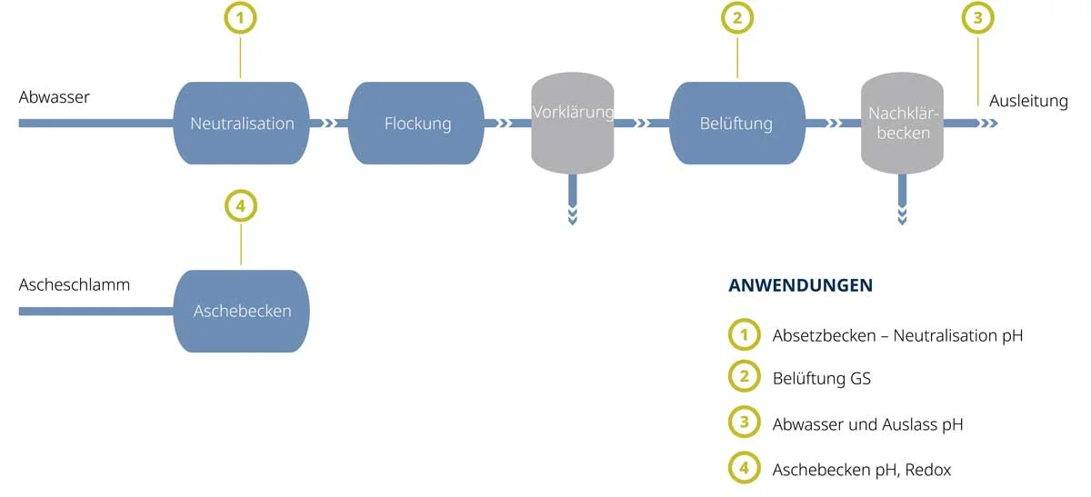 pH-Wert und Redoxpotential des Wassers im Aschebecken müssen für die Einhaltung umweltrelevanter Anforderungen innerhalb eines bestimmten Bereichs liegen.