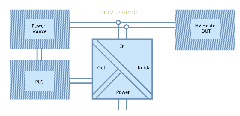 Depending on the tested product, voltages of up to 900 V DC are applied