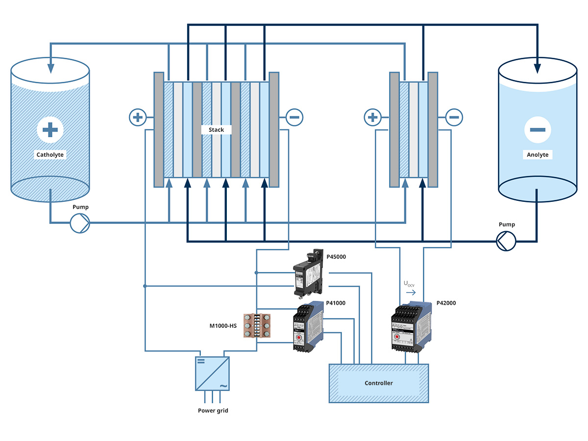 Voltages and currents in the battery stacks and strings must be reliably measured for process control and monitoring. Measuring the open-circuit voltage UOCV at a single tapped cell also provides insights into the state of charge as well as aging and degradation processes.