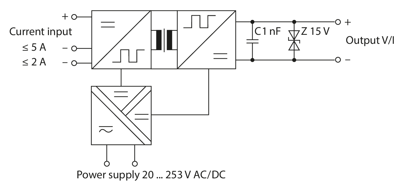 for converting input currents up to 5 A to impressed ±20 mA, ±10 V, or 4 … 20 mA output signals - New TransShield technology