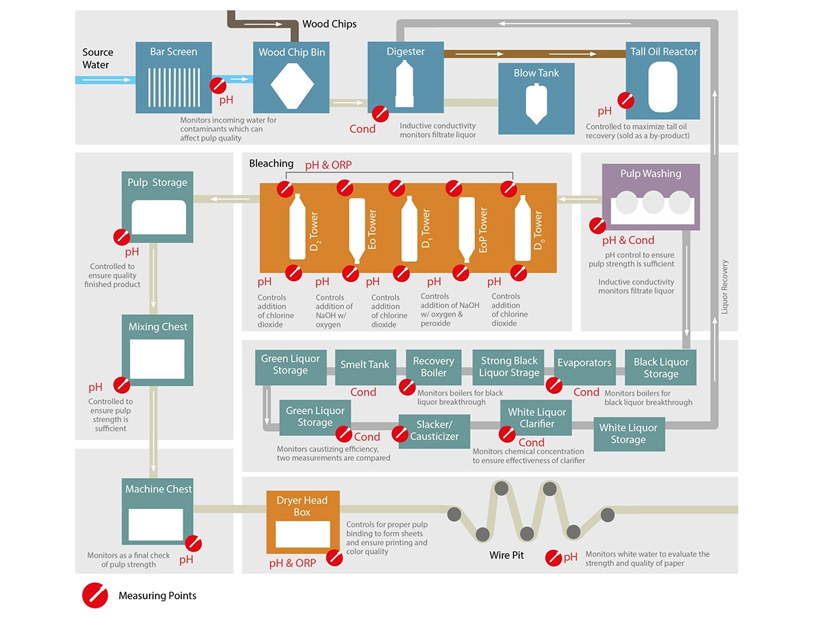 Los numerosos puntos de medición de pH y conductividad deben garantizar la calidad del proceso en las diversas secciones de producción en la producción de celulosa. Por ejemplo, especialmente durante los procesos de cocción o el blanqueamiento en torres, una digestión química demasiado intensa del material de la madera o un control insuficiente de las dosis o residuos de blanqueamiento pueden dañar las fibras y reducir su resistencia. Estos daños solo pueden detectarse en los controles de calidad finales, durante los cuales el cartón o el papel se comprueban para determinar la longitud del desgarro, así como la resistencia al desgarro y la rotura. Por lo tanto, la intensidad de la digestión química debe ser controlada y regulada. Esto se hace usando mediciones de la conductividad para supervisar la concentración de licor blanco en los digestores de celulosa.