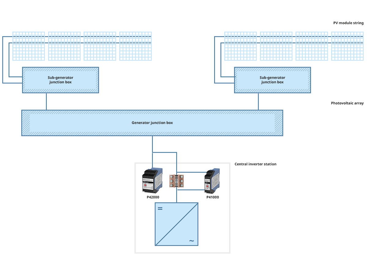 Por lo tanto, las mediciones se ejecutan mediante acondicionadores de señal conectados posteriormente con el respectivo aislamiento galvánico elevado. En los sistemas de 1000 V se requiere una separación de protección de 1000 V CA/CC conforme a la norma DIN EN 61140.