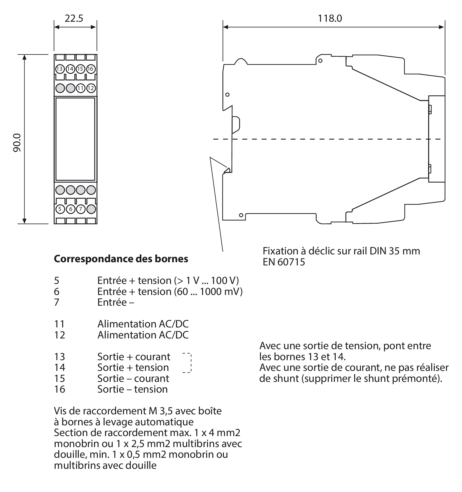 La protection contre les courants de choc est assurée par une séparation de protection de l’entrée vers la sortie et vers l’alimentation conforme à la norme EN 61140. Spécialement conçu pour la mesure du courant avec une résistance shunt.