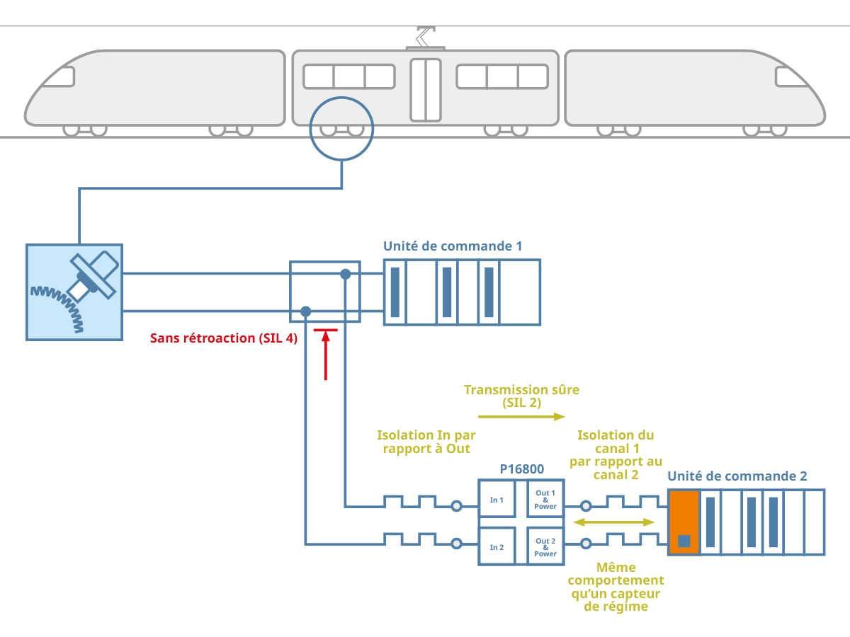 Le P16800 découple sans rétroaction le signal des sondes de vitesse à un ou deux canaux en conformité avec la norme EN 50129 (SIL 4). Les signaux découplés sont transmis aux sorties du P16800 avec une fréquence et une position de phase inchangées, si bien que le convertisseur de signaux de vitesse se comporte comme un codeur rotatif du point de vue de la commande située en aval. La transmission des signaux du codeur rotatif est réalisée par le biais d'une isolation galvanique et, si nécessaire, d'une sécurité fonctionnelle au sens de la norme EN 50129 (SIL 2). Comme pour les codeurs rotatifs, l’alimentation du P16800 est assurée par la commande connectée. Afin d’améliorer la compatibilité entre les codeurs rotatifs et les nouvelles commandes, l’appareil peut également convertir les signaux de courant des codeurs rotatifs en signaux de tension et inversement.