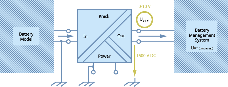 L’évaluation de la performance du BMS, lors de laquelle un bloc énergétique est soumis à toute une plage de température au sein d’une chambre climatique, demande beaucoup de temps et d’argent. C’est pourquoi les variations de température sont souvent simulées. Pour cela, des systèmes de test génèrent des tensions de commande au sein d’un modèle de batterie afin de contrôler la gestion de la température du BMS. L’émulation de la batterie utilise la tension de la batterie pour laquelle le BMS a été conçu. Il s’agit actuellement de 950 V CC et, à l’avenir, en particulier pour les véhicules utilitaires, cette tension pourrait atteindre 1 500 V CC voire même plus.