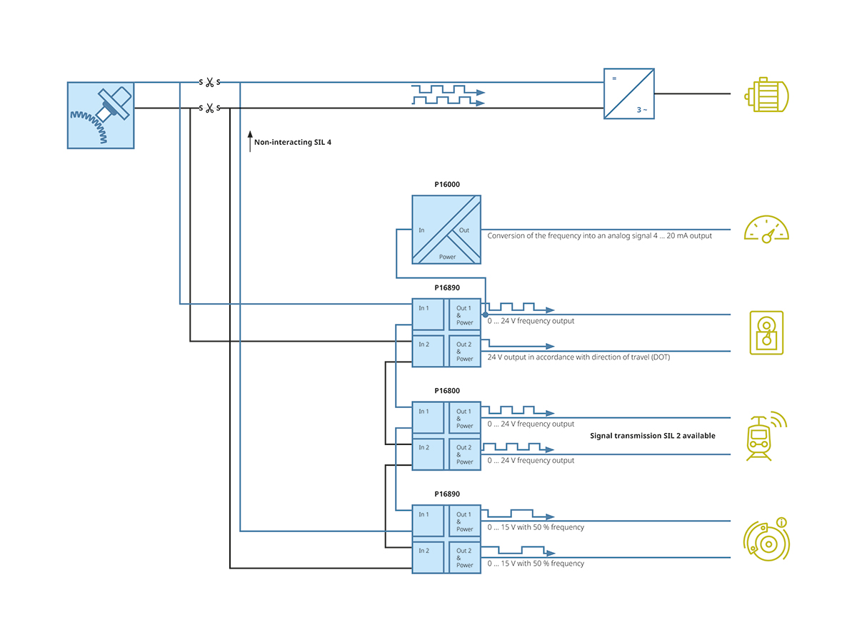 Trasmettitore frequenza di impulso per il disaccoppiamento di segnali da circuiti di commutazione rilevanti ai fini della sicurezza e duplicazione di segnali standard e di impulso. Il segnale di velocità non viene influenzato né subisce interferenze a causa di P16000 con livello di sicurezza SIL 3.