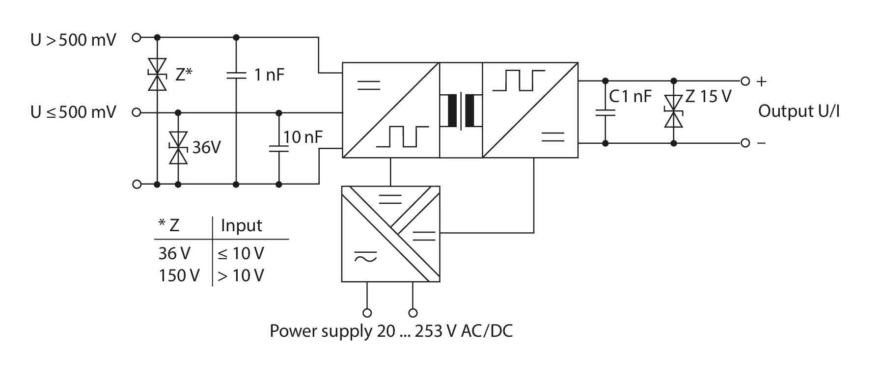 用于电压转换的通用高压隔离器,例如在分流应用中,将±60 mV至±100 V电压转换为±20mA、±10 V或4 … 20 mA的外加输出信号。