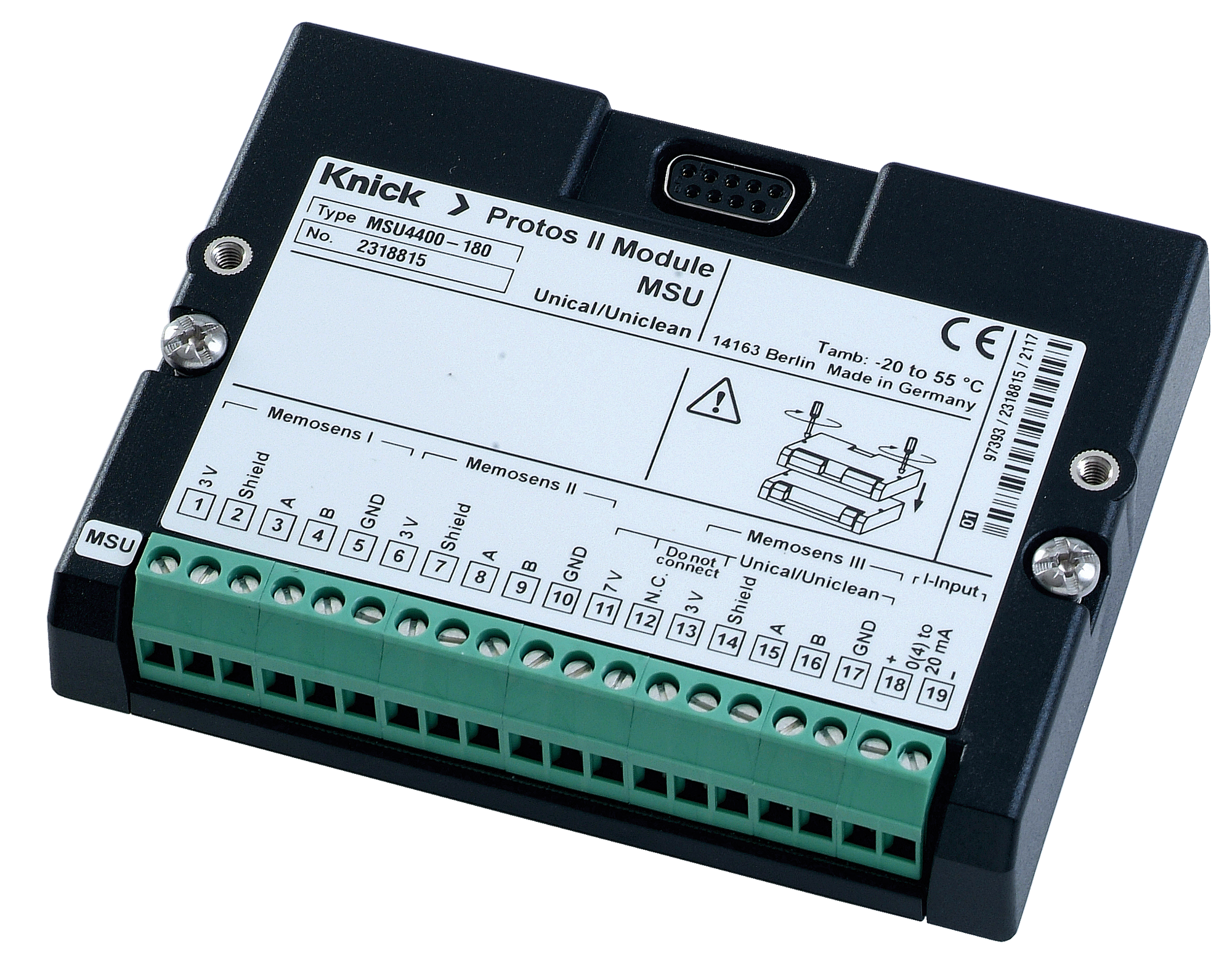 使用多通道多参数测量模块 MSU 4400(X)-180,一个模块可连接多达三个 Memosens 传感器。Protos II 4400(X) 最多可容纳两个测量模块,并可通过 MSU 4400(X)-180 轻松灵活地扩展为多通道变送器,可容纳多达 6 个 Memosens 传感器。